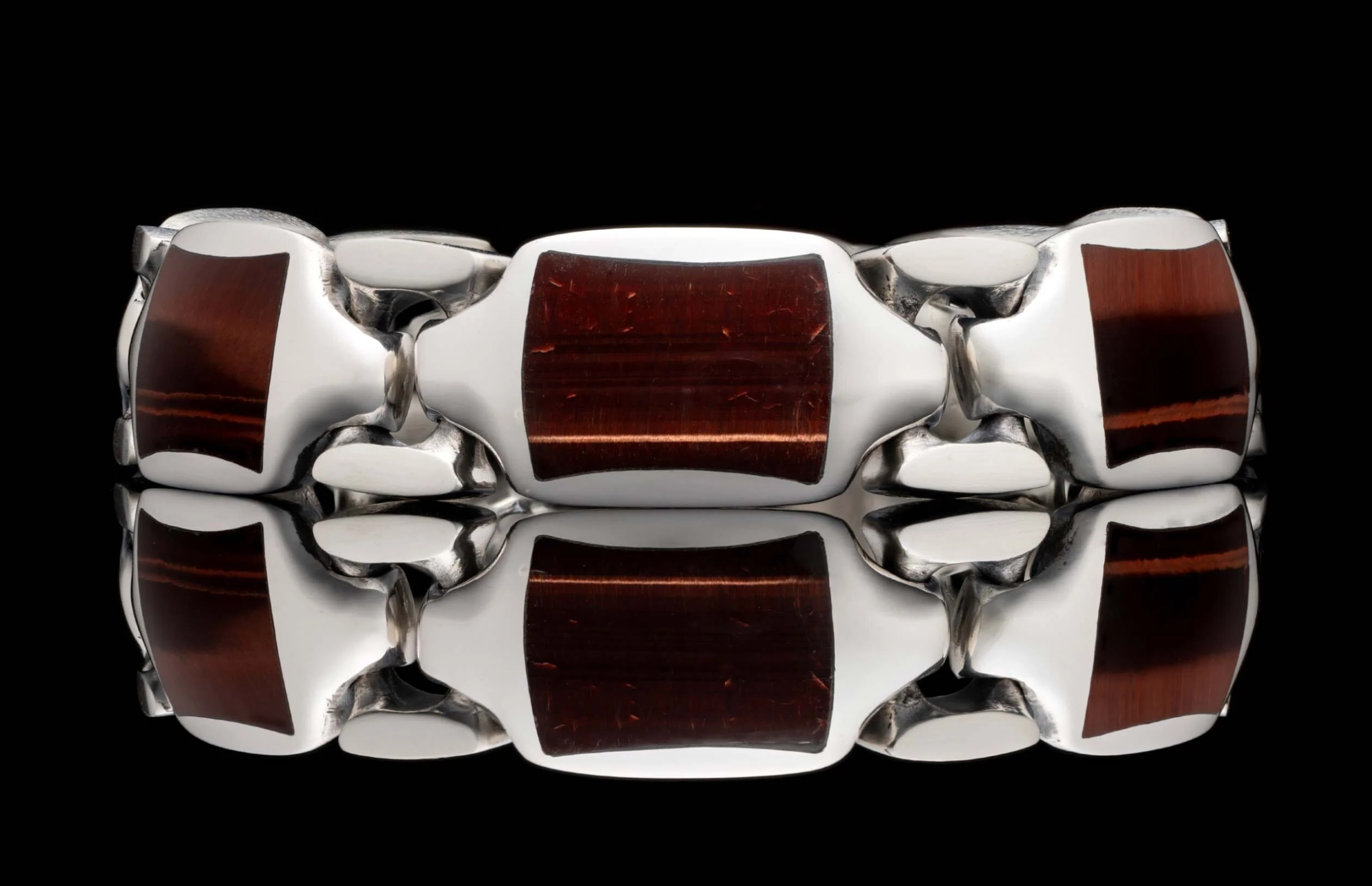 Tiger eye moves in the light like no other stone – and in these soft red hues it mesmerizes. Each link features red tiger eye inlaid into sculpted sterling silver, painstakingly hand-polished with a mix of mirror and satin textures. Finished with our interlocking sterling silver snap clasp. Day or night, 3 piece suit or denim, the Red Tiger Eye Retro elevates every style.