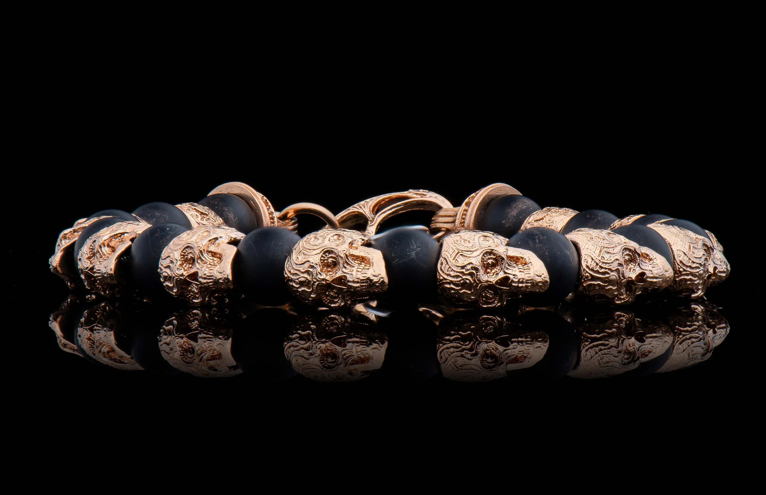 The Tint features our classic ‘sugar skull’ beads, all the way around the wrist, sculpted from solid 18k Rose Gold. We use matte finish onyx as a spacer between each gold piece, and the bracelet is finished with our end caps and custom clasp, also in solid gold. A lot of bling without the glitter, elegant and subtle and alluring. Make a statement, solo or stacked on the wrist.