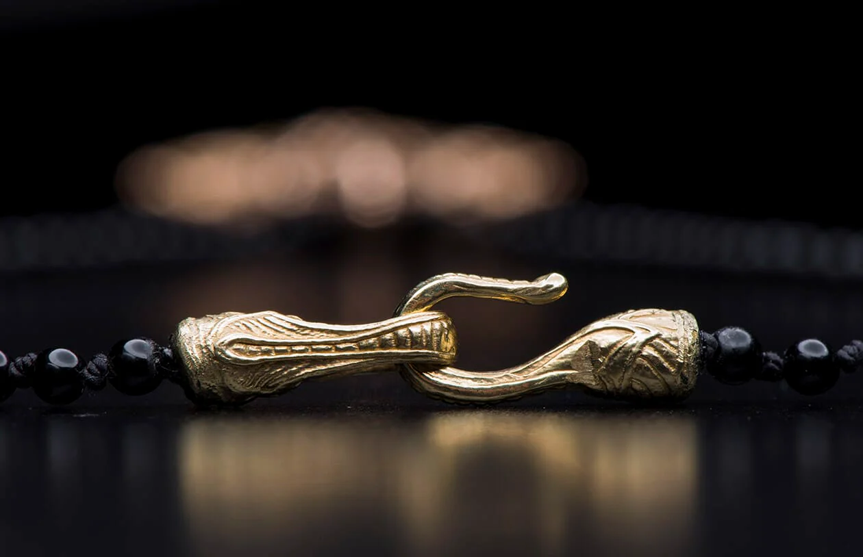 'Transcendence' is a piece inspired by heraldry and valiance thru history. Mesmerizing in solid 18K rose gold, and inlaid with frosted black onyx on one side and white mother of pearl on the other, this piece is reversible and offers two distinct statements. Each side is elegantly finished with inlaid natural pearls in the cross. Finished on a hand-knotted onyx and tactical cord chain for generations to come.