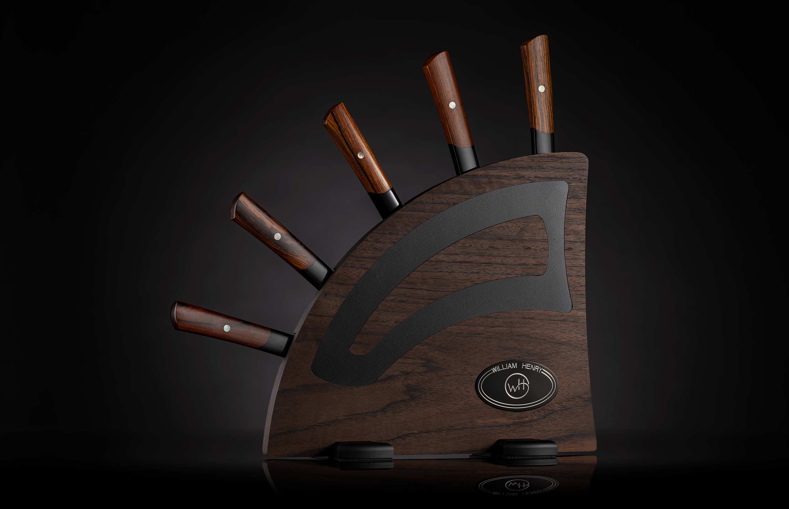 The new Kultro ‘Flare’ knife set is a stunning addition to our William Henry cutlery line. Our new Rainbow Damascus blades feature 34 layers of stainless steel, copper, and brass with a Japanese Hitachi Blue Steel core with an HRC 0f 61. These exquisite blades are finished with a beautiful Cocobolo and black lip pearl handle complete with your choice of display rack. For safe transport, they come with a sturdy leather knife roll. Like all William Henry creations, this kitchen set is sure to inspire curiosity and turn mundane tasks into an act of ceremony. Enjoy your time!