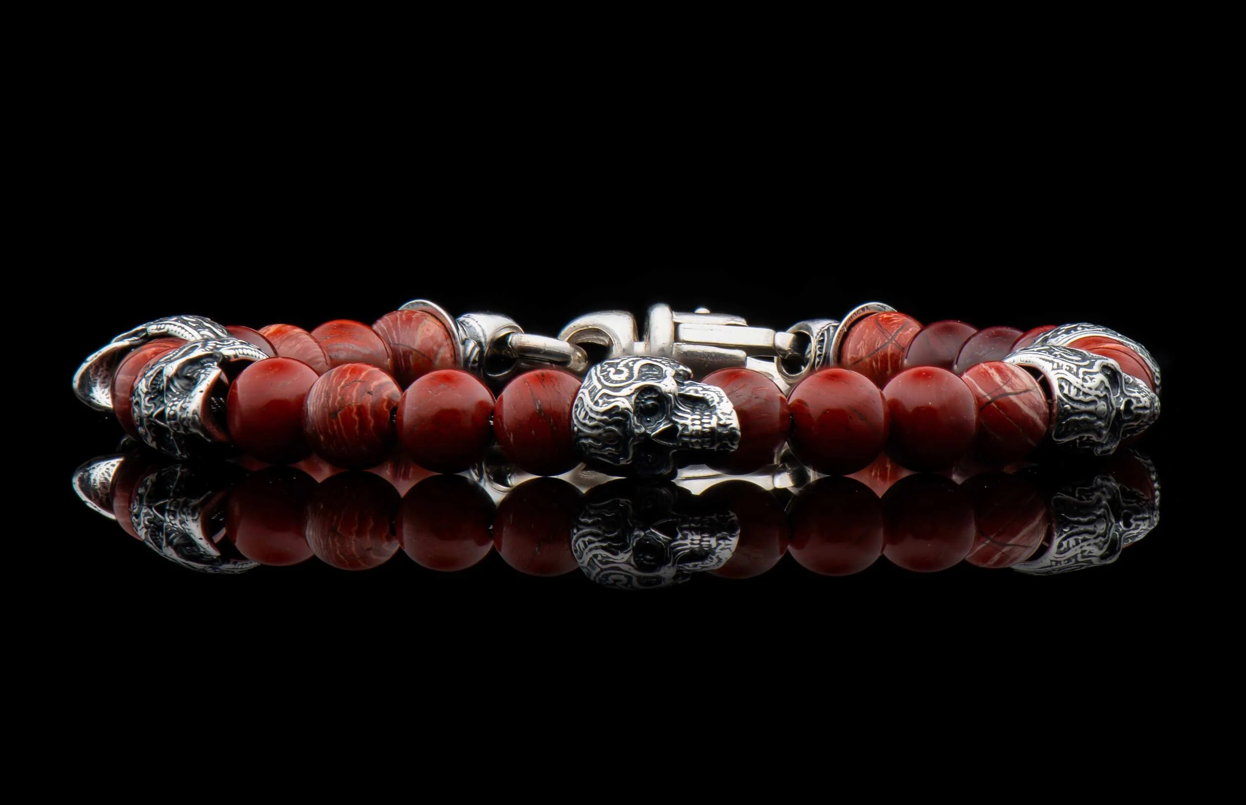 We love skulls, especially the ‘sugar skull’ style, and we proudly offer this new version of our classic, a little smaller and refined, truly unisex, great on its own or stacked with other pieces on the wrist. The ‘Red Baron’ bracelet features five skulls in sterling silver, flanked by the understated opulence of red snakeskin jasper beads and finished with our sterling swivel lobster clasp. Built on welded aircraft cable for durability.