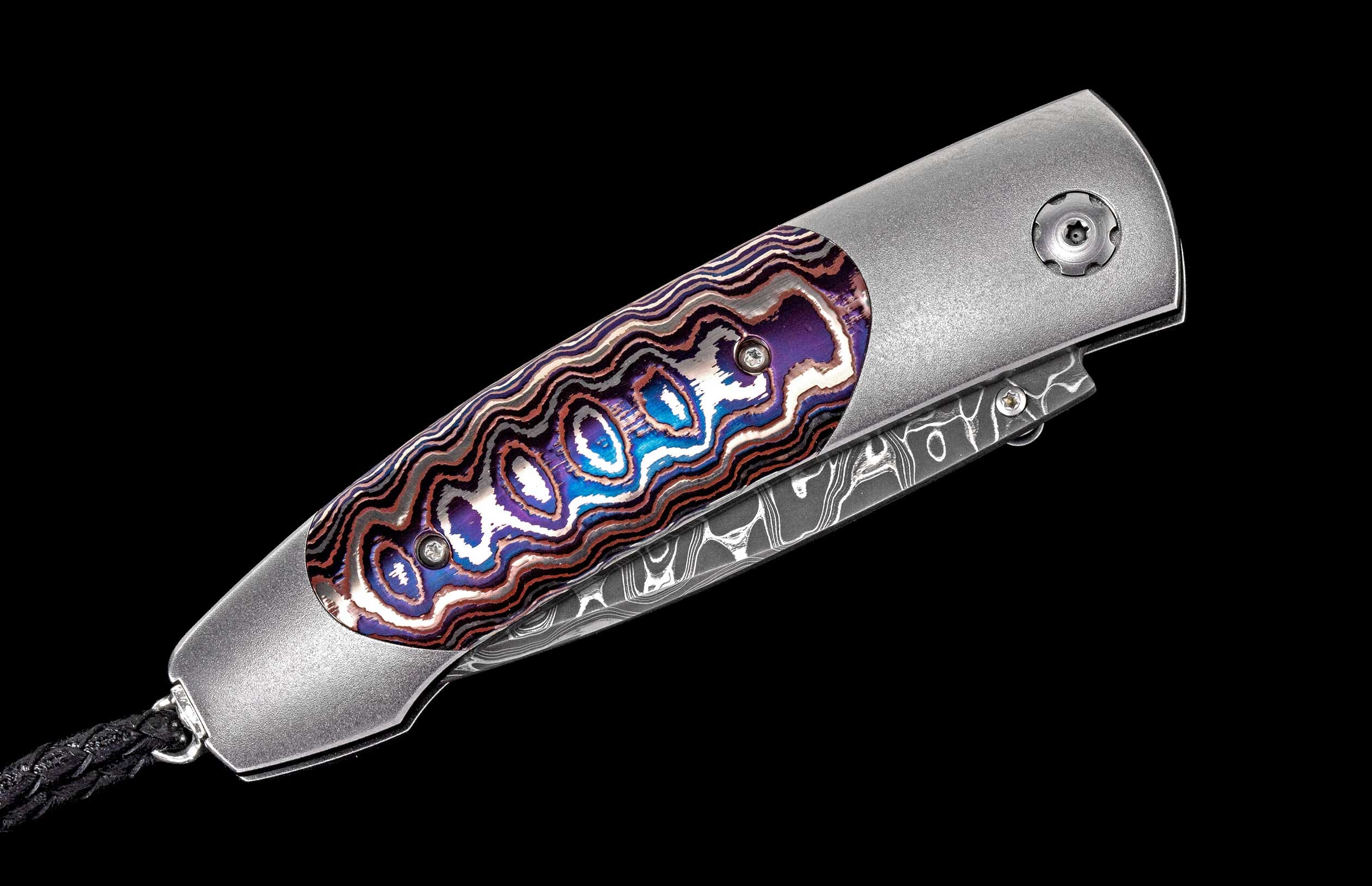 The Monarch 'Dark Fire' features a light and resilient frame which is machined from aerospace grade titanium, then finished with a fine blast-polishing. The unique inlay is crafted from heat-colored 'Wave Mokume'. The blade is hand-forged 'Intrepid' damascus steel by Chad Nichols. The one-hand button lock and the thumb stud are set with London blue topaz gemstones. The Monarch is a simple design that is easy on the eye and effortless in the hand; the elegant shape of the handle on this design is also an ideal canvas to showcase fine hand-engraving or exotic materials. The 'Dark Fire' features the rich and unique synthesis between function, exotic materials, and the superlative artistry that is the hallmark of William Henry's collection.