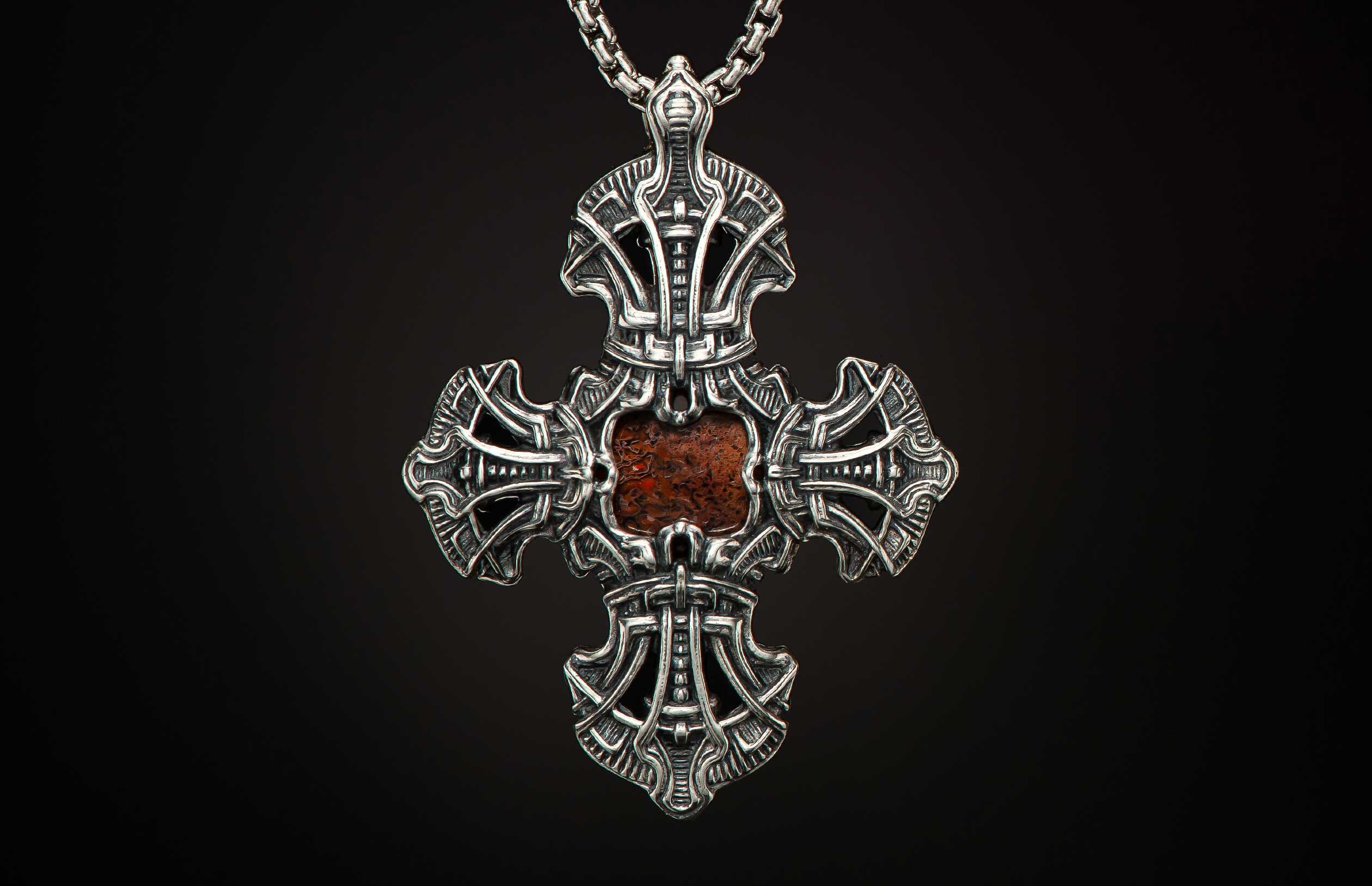 Our stylized take on the classic cross iconography, the 'Kells Cross III' pendant is a striking statement around the neck. Sculpted and skeletonized sterling silver pendant that is reversible, with a day/night or yin/yang motif that showcases 100 million year-old fossil dinosaur bone, and black onyx on the opposite side. Offered on our sterling silver box chain, and finished with a fine sterling silver clasp. This piece wears big and bold without being too heavy – modern with a nod to heraldry of the past.