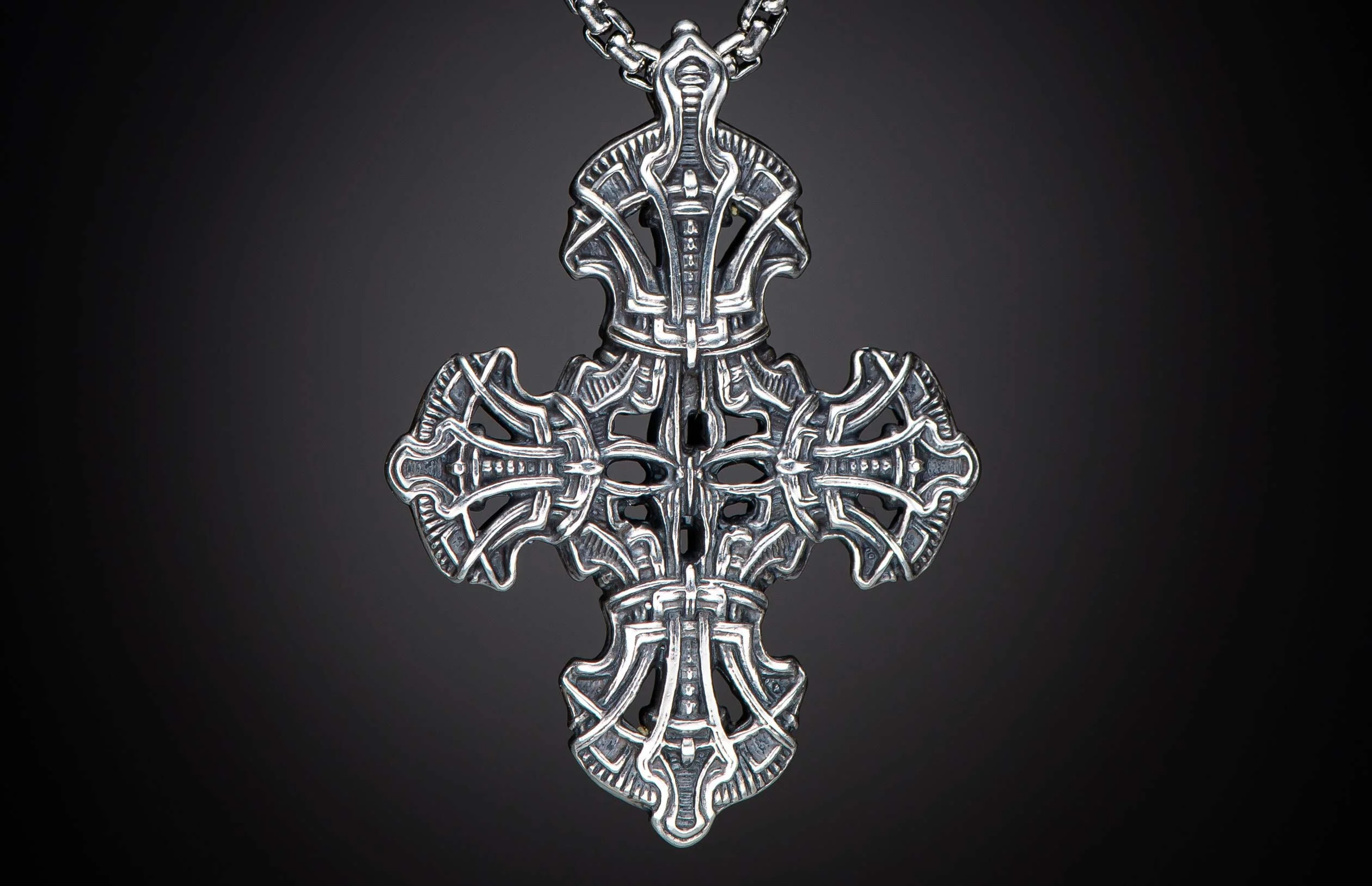The Tranquility is a beautifully sculpted cross infused with pattern and texture inspired by medieval armor. This mid-size necklace wears perfectly on its own, or it can be layered with other pieces on the neck to make whatever statement fits your style. Crafted from solid sterling silver, Tranquility is presented on a lovely rounded box chain at 2.6mm diameter with a lobster clasp closure, and both chain and clasp are also in sterling silver to create a timeless piece to serve for a lifetime.