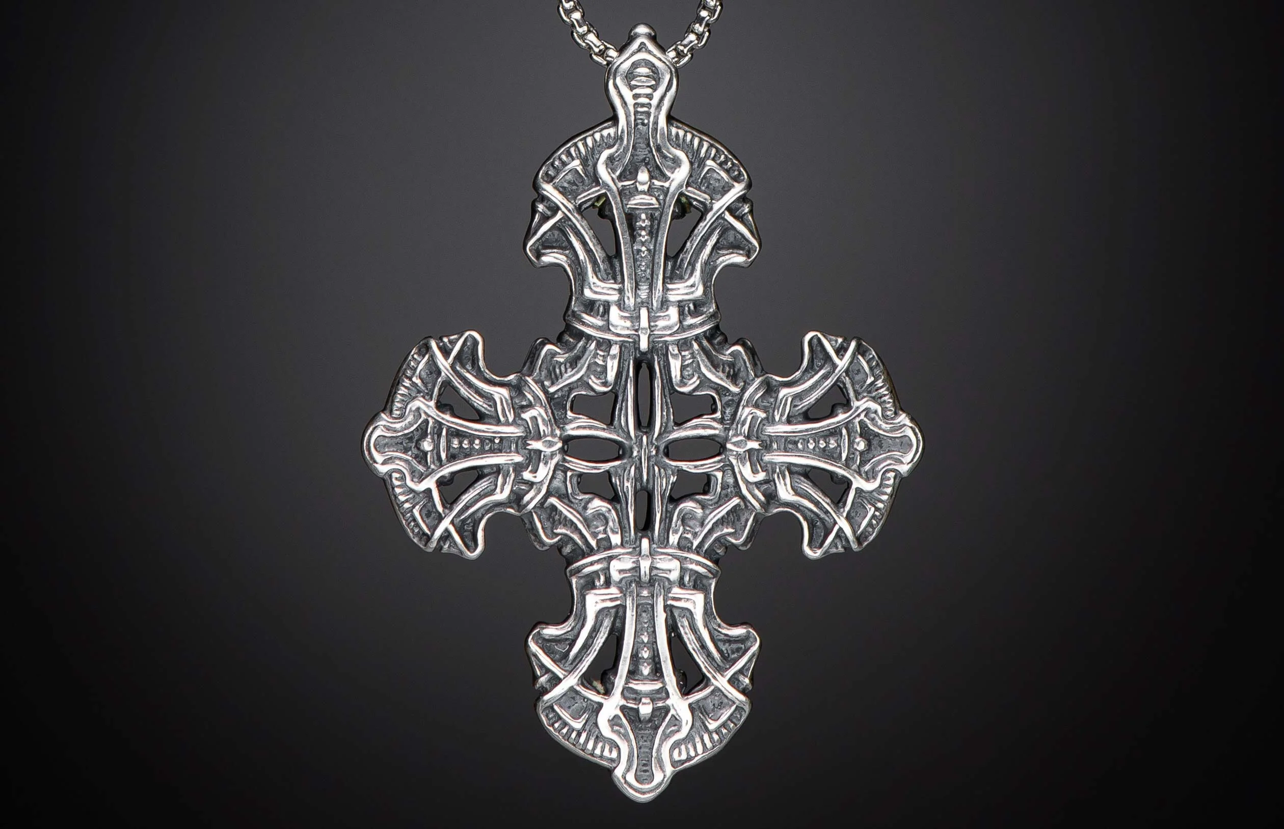 The Pax is a beautifully sculpted cross infused with pattern and texture inspired by medieval armor. This smaller necklace wears perfectly on its own, or it can be layered with other pieces on the neck to make whatever statement fits your style. Crafted from solid sterling silver, Pax is presented on a lovely rounded box chain at 1.8mm diameter with a lobster clasp closure, and both chain and clasp are also in sterling silver to create a timeless piece to serve for a lifetime.